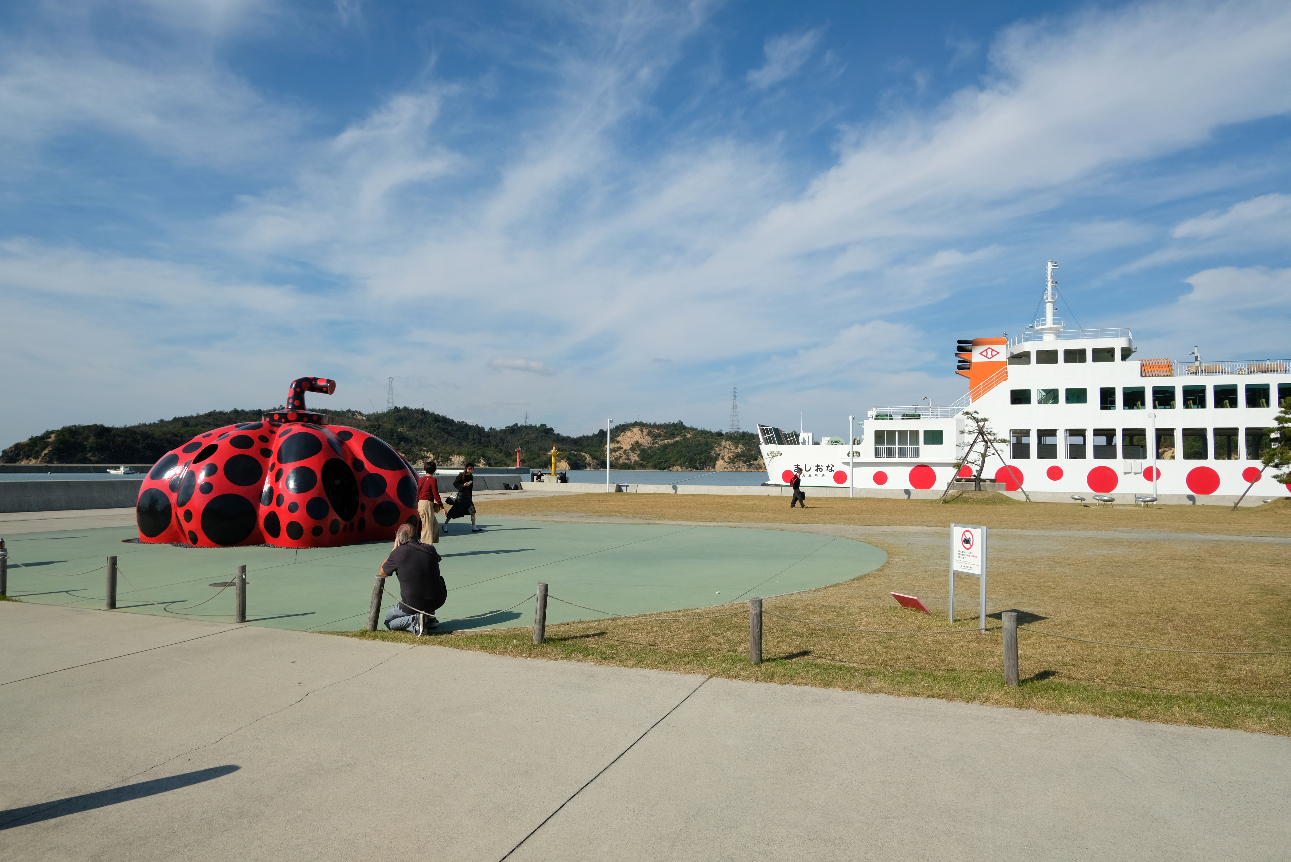 쿠사마 야요이의 시그니처 땡땡이가 그려진 배가 다가오는 모습. 배 옆에는 히라가나로 나오시마(なおしま)가 적혀있다.