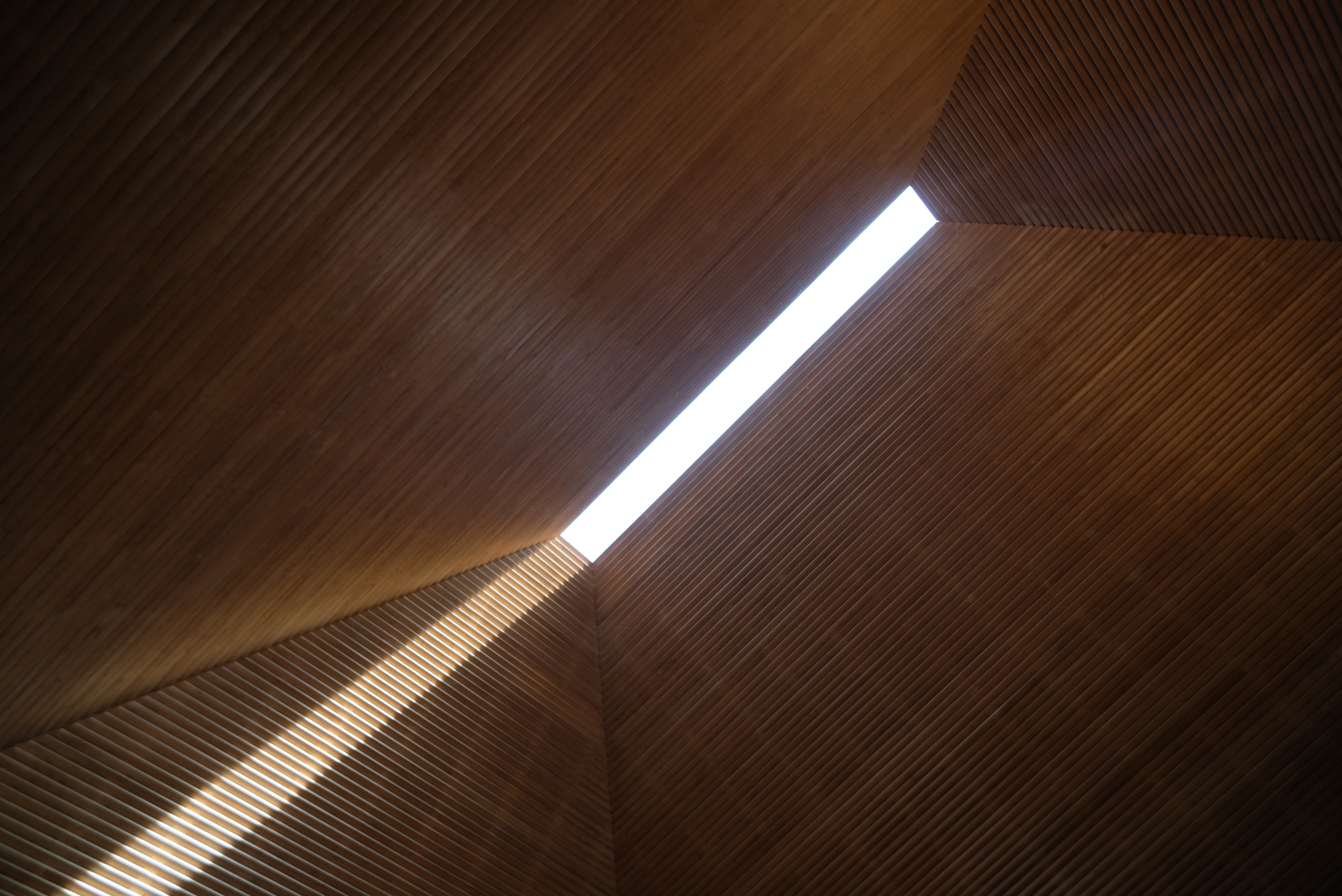 켜켜이 쌓인 천장의 목재 마감은 경이로울 정도의 마감이었다. 미적인 아름다움도 아름다움이지만 기능을 위한 디자인으로 내부의 뜨거워진 공기를 밖으로 내보내는 바람길의 역할을 하여 내부의 공기 흐름을 조절하는 창을 내었다.